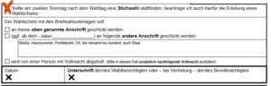 Wer per Briefwahl wählen möchte, kann wie bisher den Antragsvordruck auf der Rückseite der Wahlbenachrichtigung vollständig ausfüllen, unterschreiben und in einem ausreichend frankierten Umschlag per Post versenden.